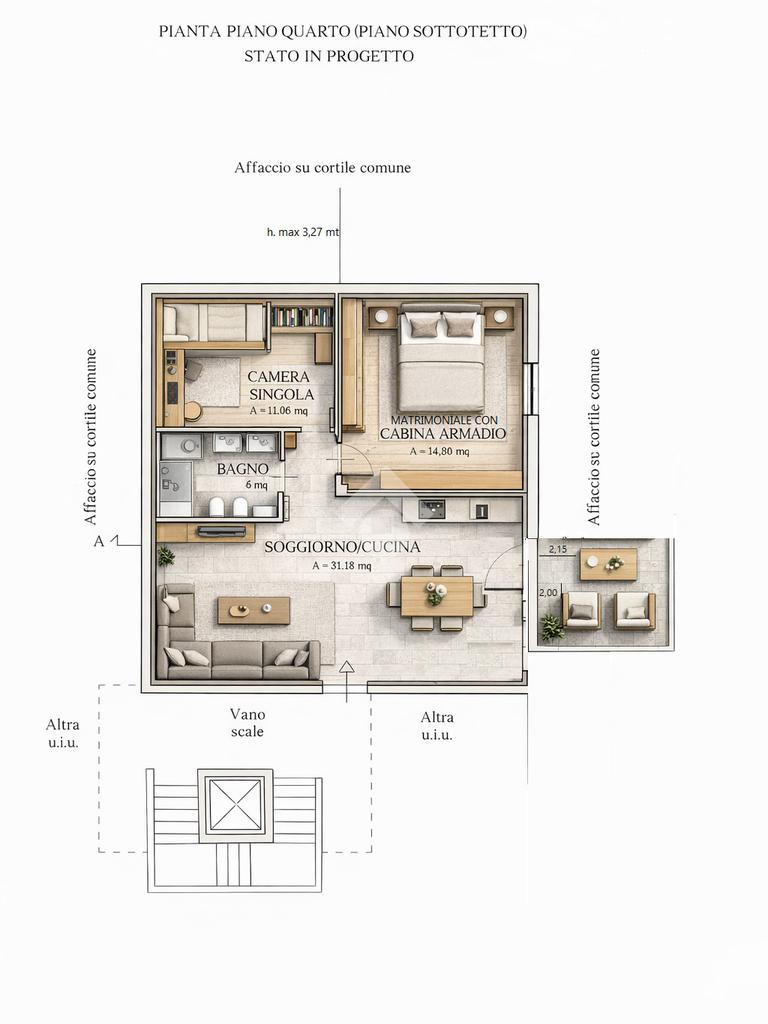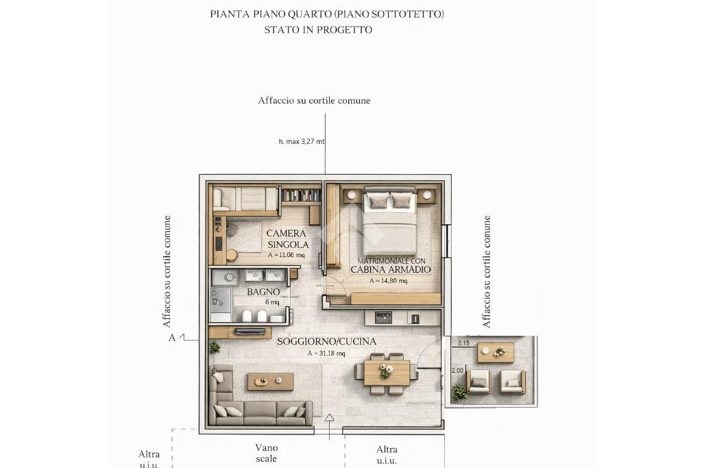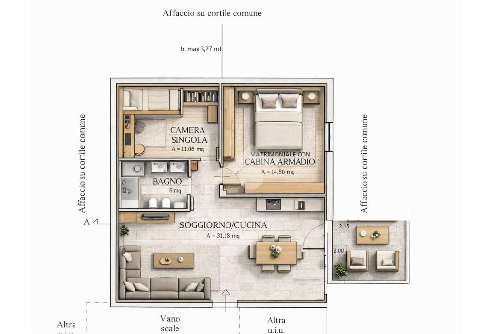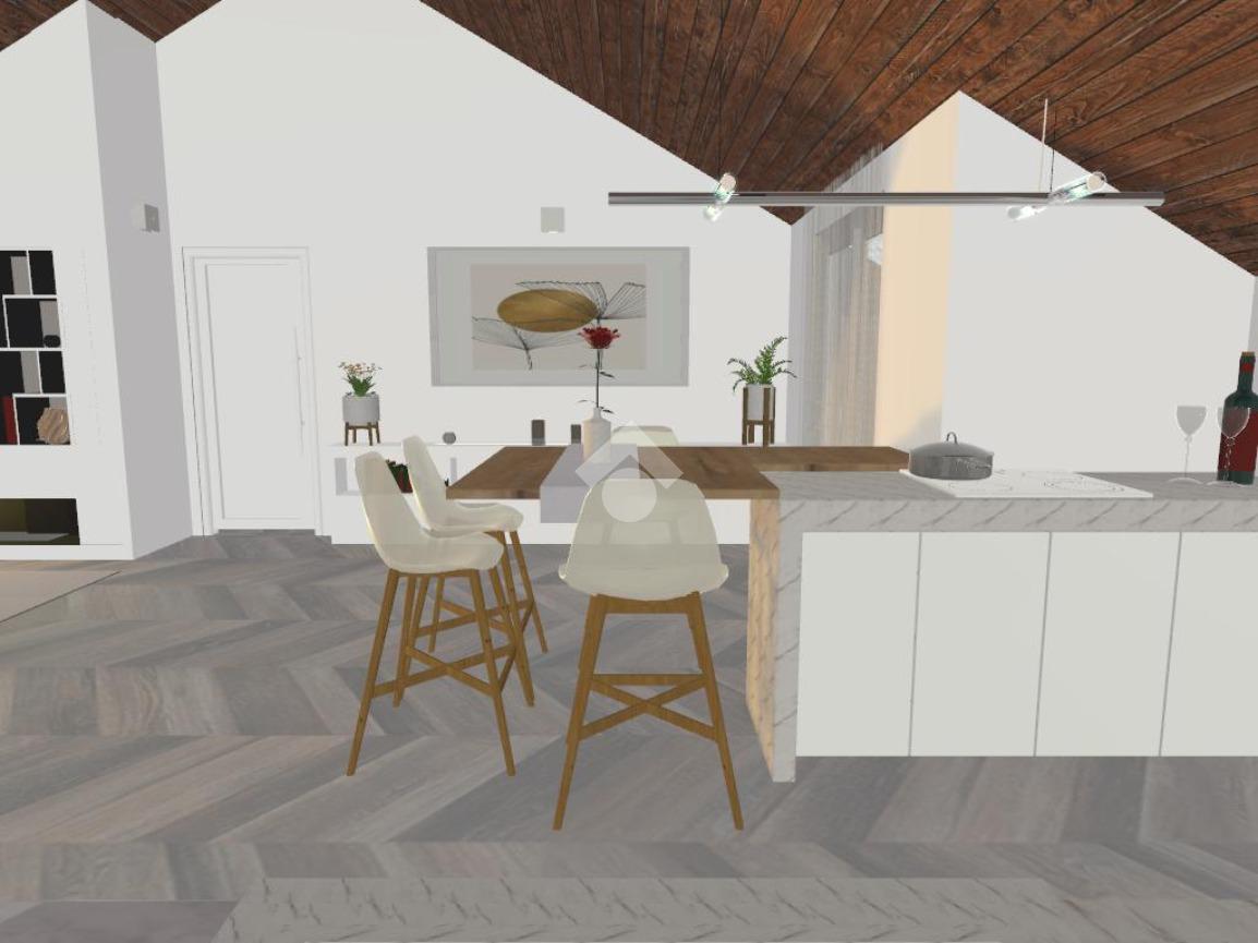 L’ipotesi progettuale prevede un ingresso su un luminoso soggiorno living con cucina a vista di circa 31 mq, concepito come ambiente centrale della casa, accogliente e ben distribuito, con la possibilità di realizzare un terrazzino che regala una suggestiva vista panoramica e un piacevole sfogo esterno.